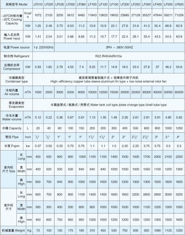 LF 系列低溫分體式冷凍機(jī)最低溫度可降至-35℃~-40℃,能滿足絕大部分低溫儀器的需求。壓縮機(jī)、水泵、溫控表、壓力控制等關(guān)鍵部件優(yōu)先使用進(jìn)口品牌產(chǎn)品,運(yùn)行穩(wěn)定,性能良好,因壓縮機(jī),散熱風(fēng)扇都安裝在室外,所以,室內(nèi)基乎無噪音。蒸發(fā)器采用不銹鋼盤管或不銹鋼板換制成,耐腐蝕、抗凍,溫度設(shè)置可在 -35℃~+35℃之間任意調(diào)節(jié)。是醫(yī)療,化工,實(shí)驗(yàn)室等領(lǐng)域低溫儀器制冷降溫的主要力量!