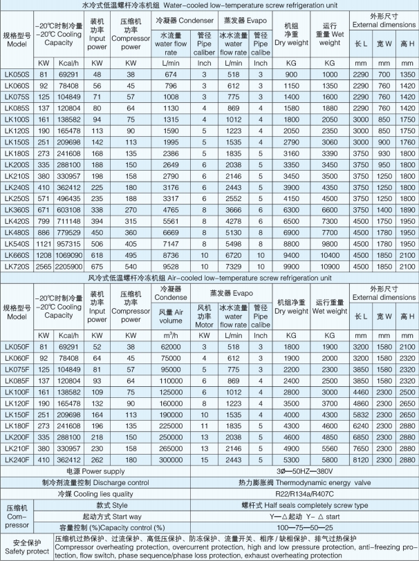 LK 系列低溫螺桿冷凍機(jī)組是針對(duì)鋼鐵、醫(yī)藥、電子、化工、食品等特殊行業(yè),根據(jù)多年工業(yè)用冷凍機(jī)組設(shè)計(jì)經(jīng)驗(yàn),綜合國(guó)內(nèi)外先進(jìn)技術(shù)精心設(shè)計(jì)研發(fā)的低溫冷凍設(shè)備,其溫度范圍可在 -30℃ -0℃之間任意調(diào)節(jié),壓縮機(jī)優(yōu)選采用進(jìn)口品牌的新型螺桿壓縮機(jī)。系統(tǒng)零部件及電氣控制元件均優(yōu)選采用進(jìn)口品牌,性能穩(wěn)定可靠,控制系統(tǒng)采用 PLC 觸摸屏控制,使操作更為簡(jiǎn)便。可根據(jù)客戶需求訂制各種使用工況的冷凍設(shè)備。