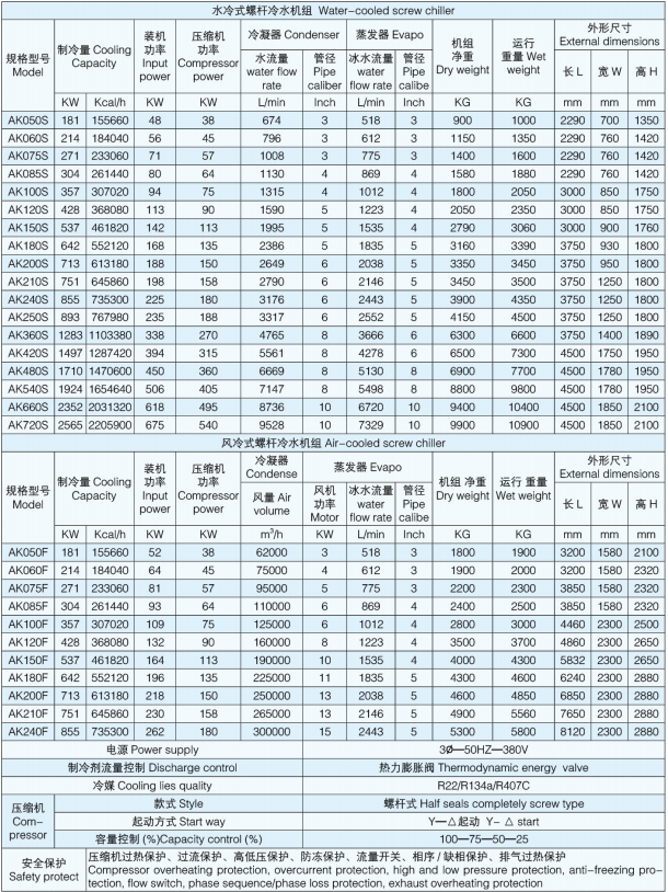 AK 系列螺桿冷水機(jī)組優(yōu)選采用國(guó)際知名品牌螺桿壓縮機(jī),配套優(yōu)質(zhì)高效節(jié)能銅管制作冷凝器,蒸發(fā)器及世界名牌控制元件,使機(jī)組具備體積小、噪音低、能量大、壽命長(zhǎng)、操作簡(jiǎn)便等優(yōu)點(diǎn),其優(yōu)美精巧的外形設(shè)計(jì)和可靠穩(wěn)定的高效能品質(zhì)在同類(lèi)產(chǎn)品中出類(lèi)拔萃!